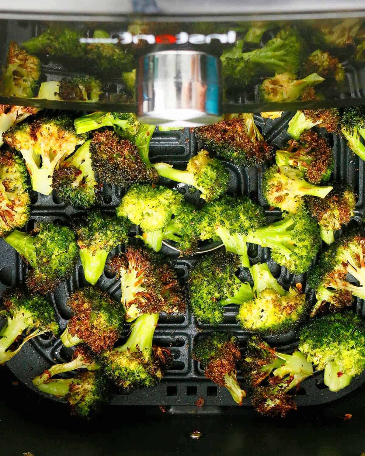 - Finish cooking. Cook for 5โ7 minutes, shaking the basket halfway through, until the broccoli turns a vibrant green with lightly charred edges.