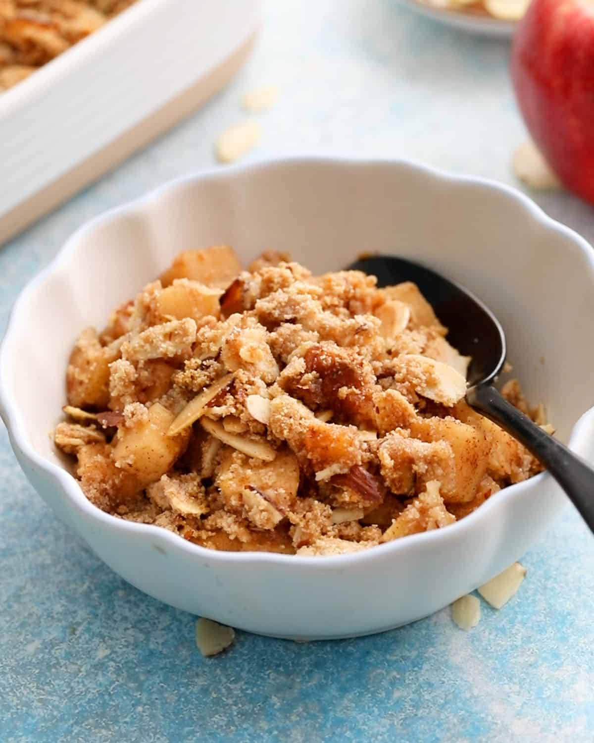 This Gluten‑Free Apple Crumble features juicy cinnamon‑spiced apples topped with almond flour crumble topping. Made without oats, it is vegan, dairy-free, low-carb, and makes a healthy apple dessert for fall!